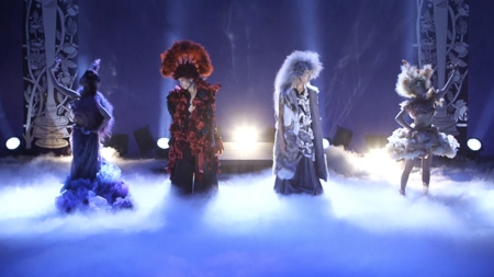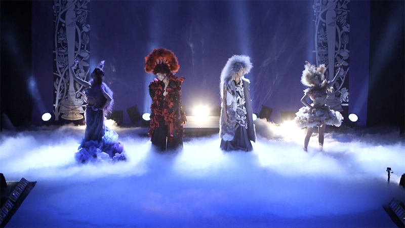 日本文化である歌舞伎と能のエッセンスをヘアメイクに反映し、巨大な折り鶴を背景に全体を白を基調とし、シンプルな中に「和」を表現。